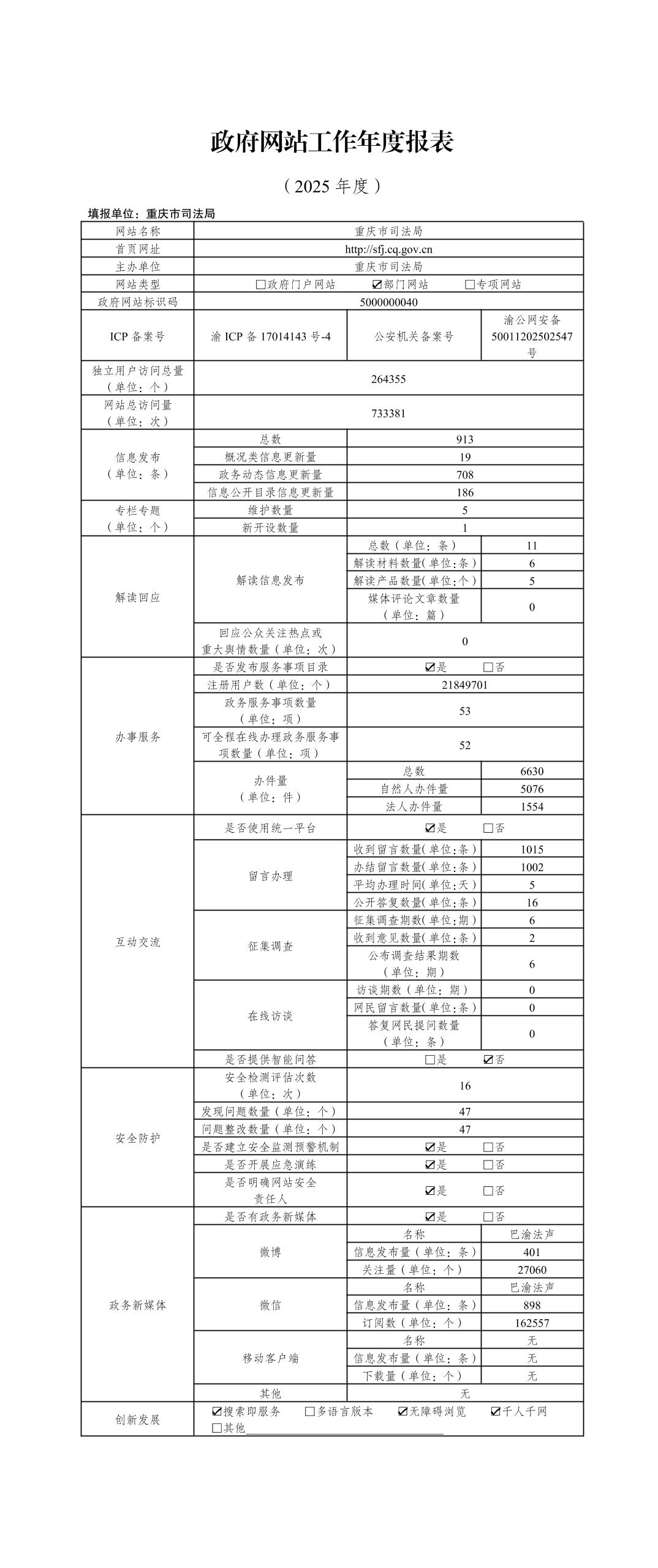 重庆市司法局2025年度政府网站工作年度报表